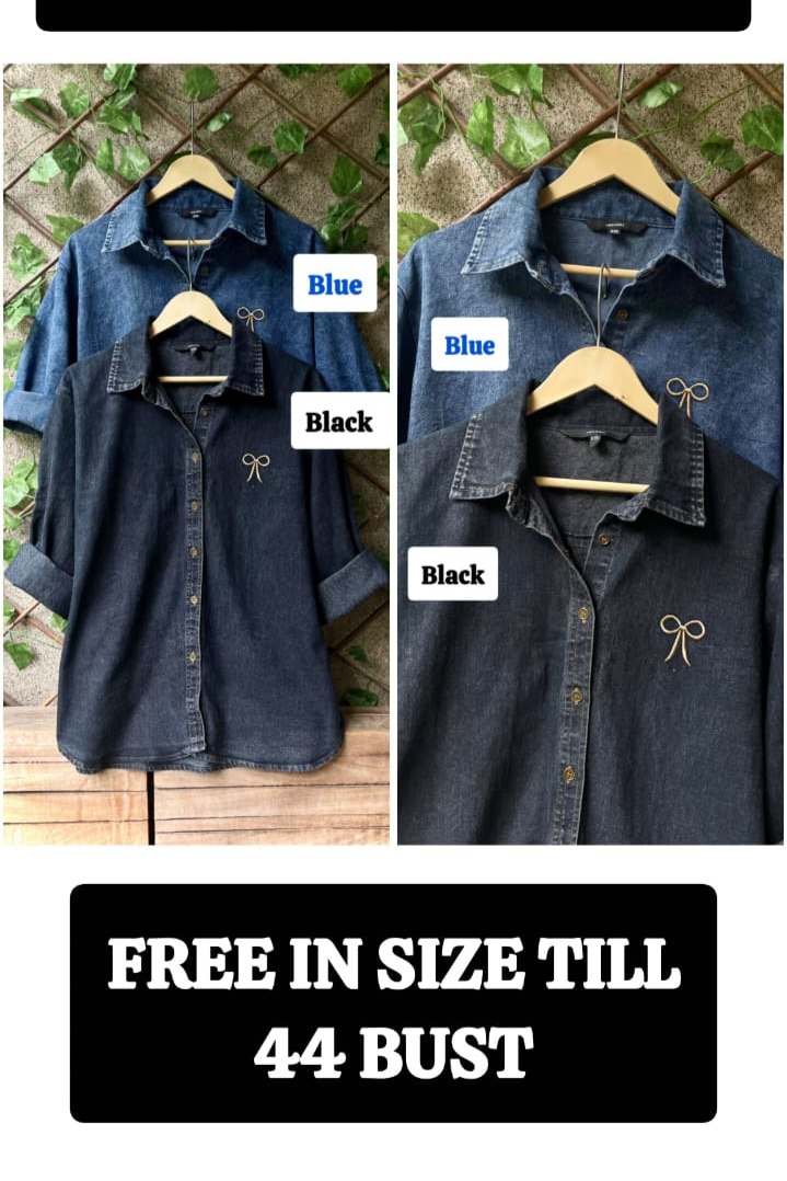Embroidered Denim Shirt, Luxury Fabric, Intricate Stitching, Casual Wear, Women’s Top, Free Size Design, Stylish Apparel, Versatile Outfit