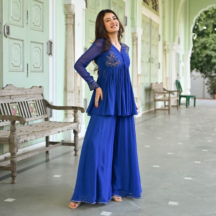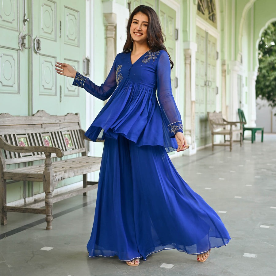 Elevate your ethnic wardrobe with this stunning peplum style top and matching sharara set, crafted from pure premium chiffon fabric that drapes beautifully. The ensemble features intricate hand embroidery that adds a luxurious touch to every curve, making it perfect for festive occasions and special events. The flared sharara creates a dramatic silhouette while the tailored peplum top accentuates your waistline for a flattering fit.